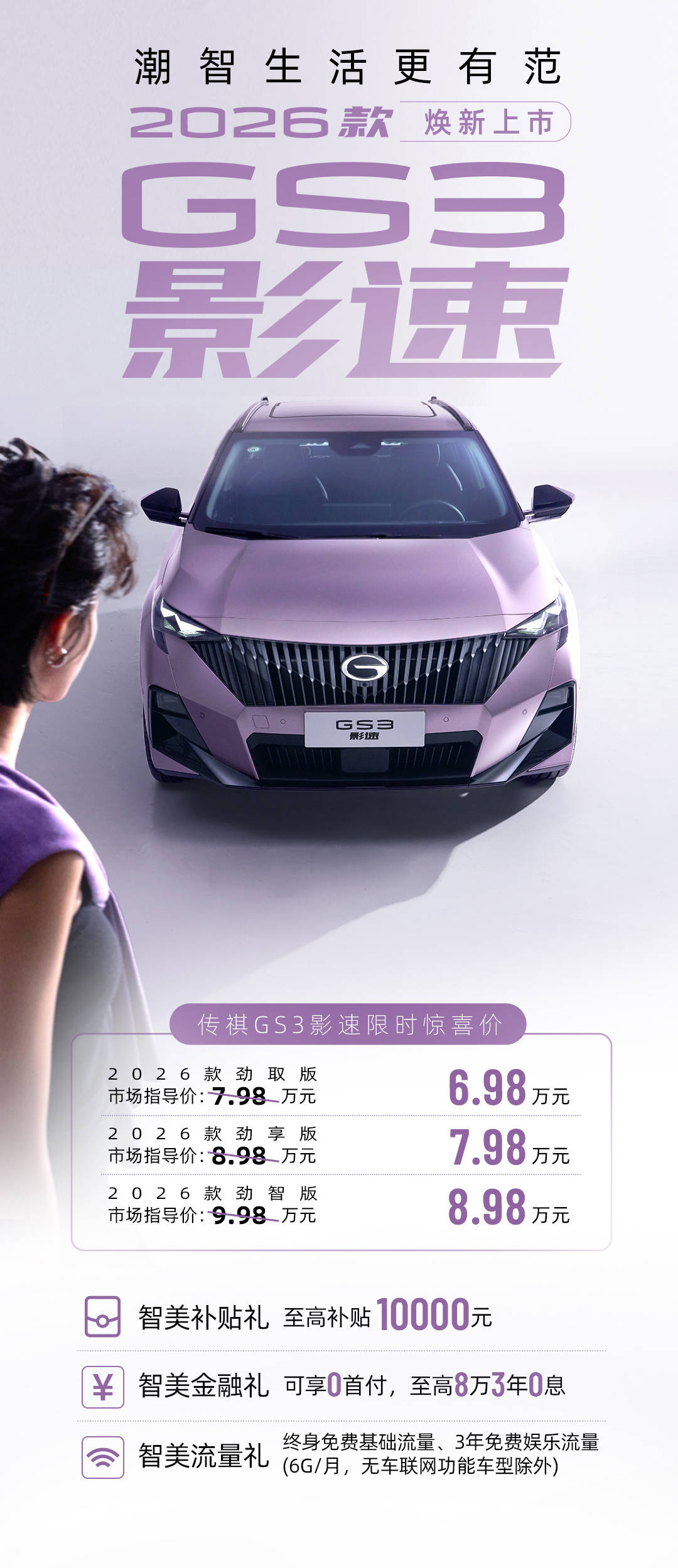 10月27日,2026款广汽传祺GS3影速上市,新车共推出3款车型,官方售价7.98-9.98万元,限时惊喜价6.98-8.98万元。与此同时,新车还推出了智美补贴礼:至高补贴10000元;智美金融礼:可享0首付,至高8万3年0息;智美流量礼:终身免费基础流量、3年免费娱乐流量(6G/月,无车联网功能车型除外)。